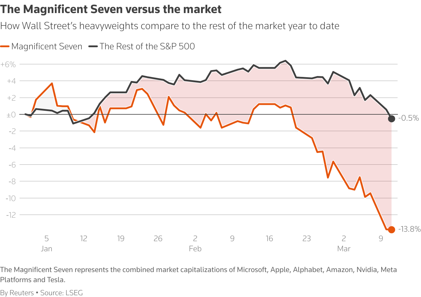 The graph below from Reuters illustrates the dominance of the Mag 7 in the recent drop in the S&P 500. The orange line depicts the year-to-date drop in the Mag 7, falling about 14% in the aggregate, while the remaining 493 stocks in the Index were down about 0.5%.