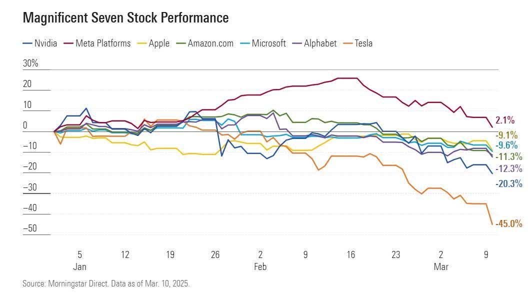 While the year-to-date drop in the Mag 7 was around 14%, the returns of the individual components were varied. Although most of the Mag 7 companies were down in the neighborhood of 10%, Meta was actually up about 2%, while Tesla had plunged 45%. The details can be seen in the graph below from Morningstar.