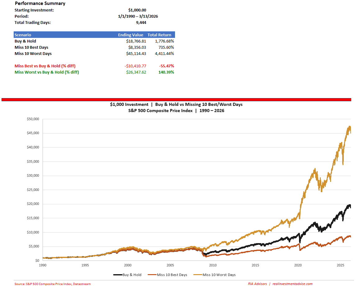 The shock to the oil market created by the war with Iran is increasing fear in the markets. However, some areas were already showing weakness, such as the 2025 labor market. New jobs created averaged only about 15,000 per month and continue that path so far in 2026. The Atlanta Fed 4th quarter GDP estimate, at one point, was over 5% annualized; however, the latest revision put growth at 0.7% annualized. According to the Buffett Indicator (first graph), the stock market is significantly overvalued. And while some claim “missing” the biggest market up days hurts long-term returns, the reality is missing the biggest down days is even more beneficial for returns. The second graph below shows a scenario of actual impacts. Risk of a significant reversion to the mean valuation must be considered for investors. While Fed and Federal government interventions have “rescued” recent market drops, one needs to be prepared for the potential of not so quick recoveries.