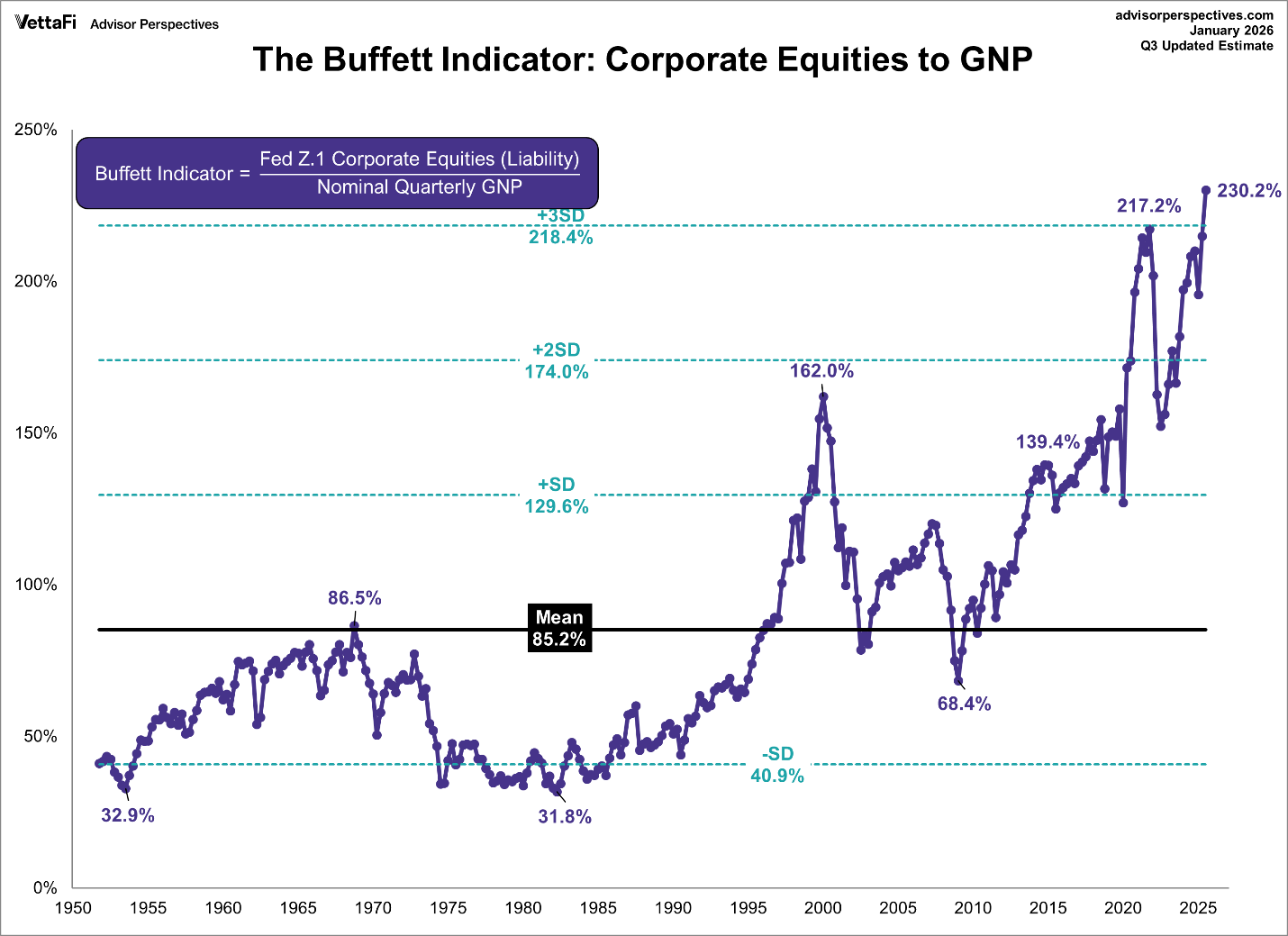 In any event, the current weakness in the economy is putting pressure on an already overvalued stock market. Intra-day volatility has picked up significantly. And even though both the Dow and S&P 500 are slightly down for the year, valuations remain near an all-time high. The chart below from VettaFi illustrates The Buffett Indicator, or Corporate Equities divided by the economy (GNP in this graph). The last reading was 230.2% or 145% above the mean, which is over three standard deviations. These rare occurrences always eventually revert to the mean or below. Notice in the graph that in the early 1980’s valuations were 31.8% below the mean. Just to give an example of what it would take to reach those levels, the S&P 500 Index would have to fall by almost 63% to reach the mean, and a plunge of almost 86% to reach the undervalued level of 31.8%.